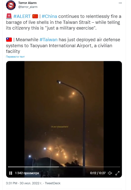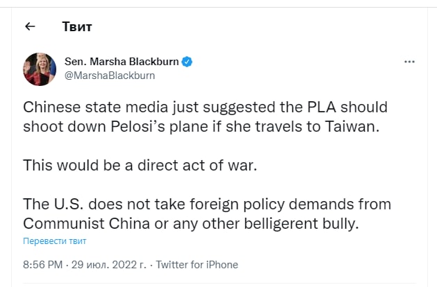 "Chinese state media has just suggested that the PLA (People's Liberation Army of China) shoot down Pelosi's plane if she goes to Taiwan