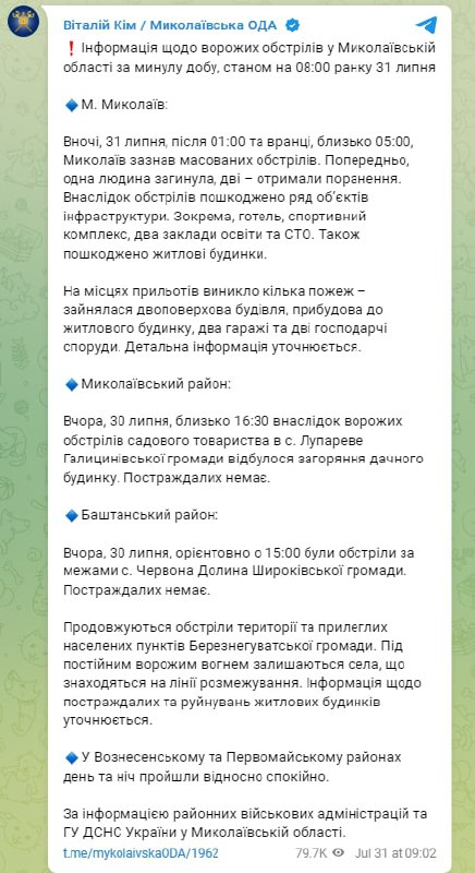 As a result of the massive shelling of Mykolayiv, one person was killed and two others were wounded. The Russian occupants damaged a number of infrastructure facilities, including a hotel, a sports complex, two educational institutions and a service station, as well as residential buildings.
