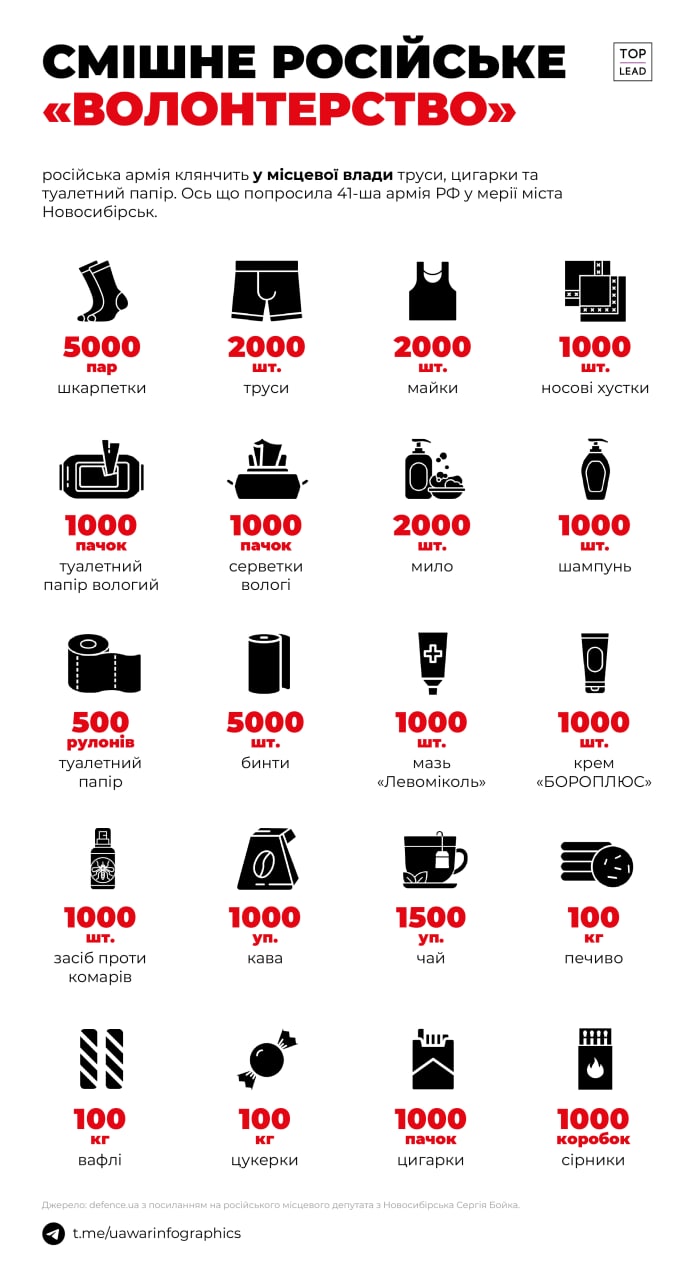 The Lithuanians donated to the Bayraktar in one day. The number of donations to the local armed forces from the Ukrainians is so grandiose that it is impossible to calculate them in principle. The Russian army is begging the local authorities for underwear, cigarettes and toilet paper. This is what the 41st Army of the Russian Federation requested from the Novosibirsk mayor's office.