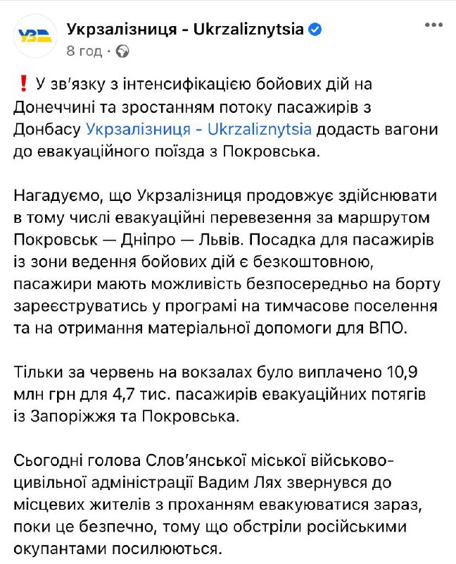 Due to the intensification of combat operations in Donetsk region and the growing flow of passengers from Donbas, Ukrzaliznytsia will add cars to the evacuation train from Pokrovsk.