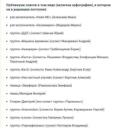 The Fontanka newspaper published a list of musical performers whose performances in Russia are considered undesirable.