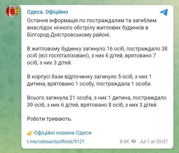 Forwarded from PUBLIC NEWS The death toll from a missile strike on the Belgorod-Dniester district of Odessa region has risen to 20 people, according to the SES. In a high-rise building, which was hit by a Russian missile at night, 16 people died and more than 30 were injured. At the nearby recreation center, four people were killed and five others were injured. People may remain under the rubble of the base, rescue work continues https://youtu.be/ntUBCYFWSME YouTubeExplosion in Odesa region: 20 dead and destroyed high-rise building On the night of July 1, an explosion took place in Odesa region - a rocket hit a nine-story building and two rest areas. The strike in the Belgorod-Dniester district killed 20 people, the SES said. Almost 40 more are injured. The search continues. # одеса # війна Website: https://suspilne.media Latest news and announcements on Facebook: https: //www.facebook.com/suspilne.news/ Read us on Twitter: https://twitter.com/suspilne_news On Instagram : https://www.instagram.com/suspilne.news/ News in Telegram: https://t.me/suspilnenews Join the community in Viber: https://bit.ly/3oW31Rz Policy of interaction with the audience on digital platforms Public: https://bit.ly/3t