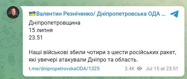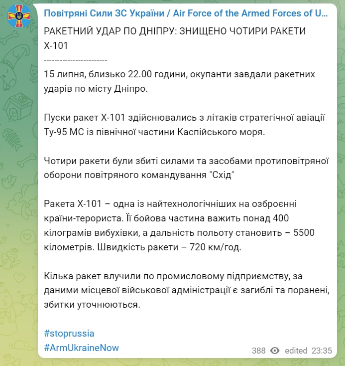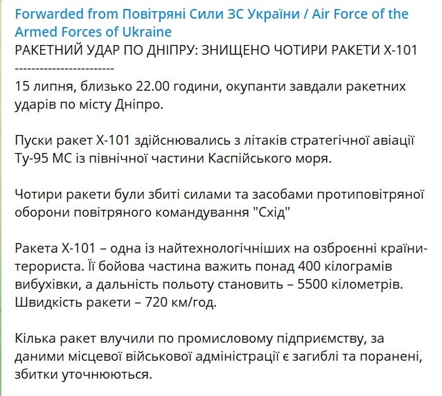 MISSILE STRIKE ON THE DNIPRO: FOUR X-101 MISSILES DESTROYED