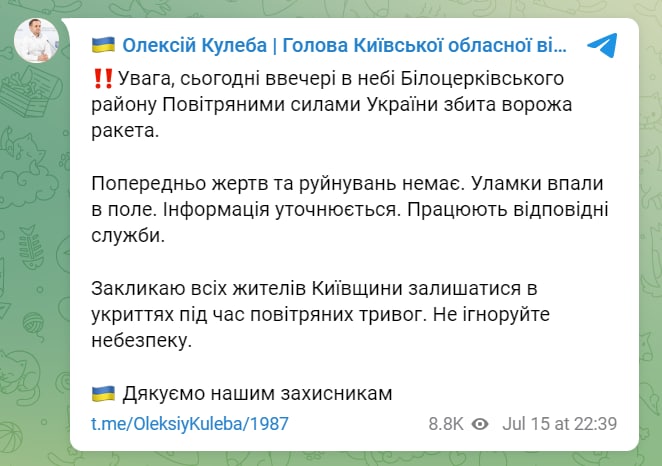 ❗️ In the sky over the Bila Tserkva district of the Kyiv region, Ukrainian air defense forces shot down a Russian missile, said Oleksiy Kuleba, head of the Kyiv OVA.
