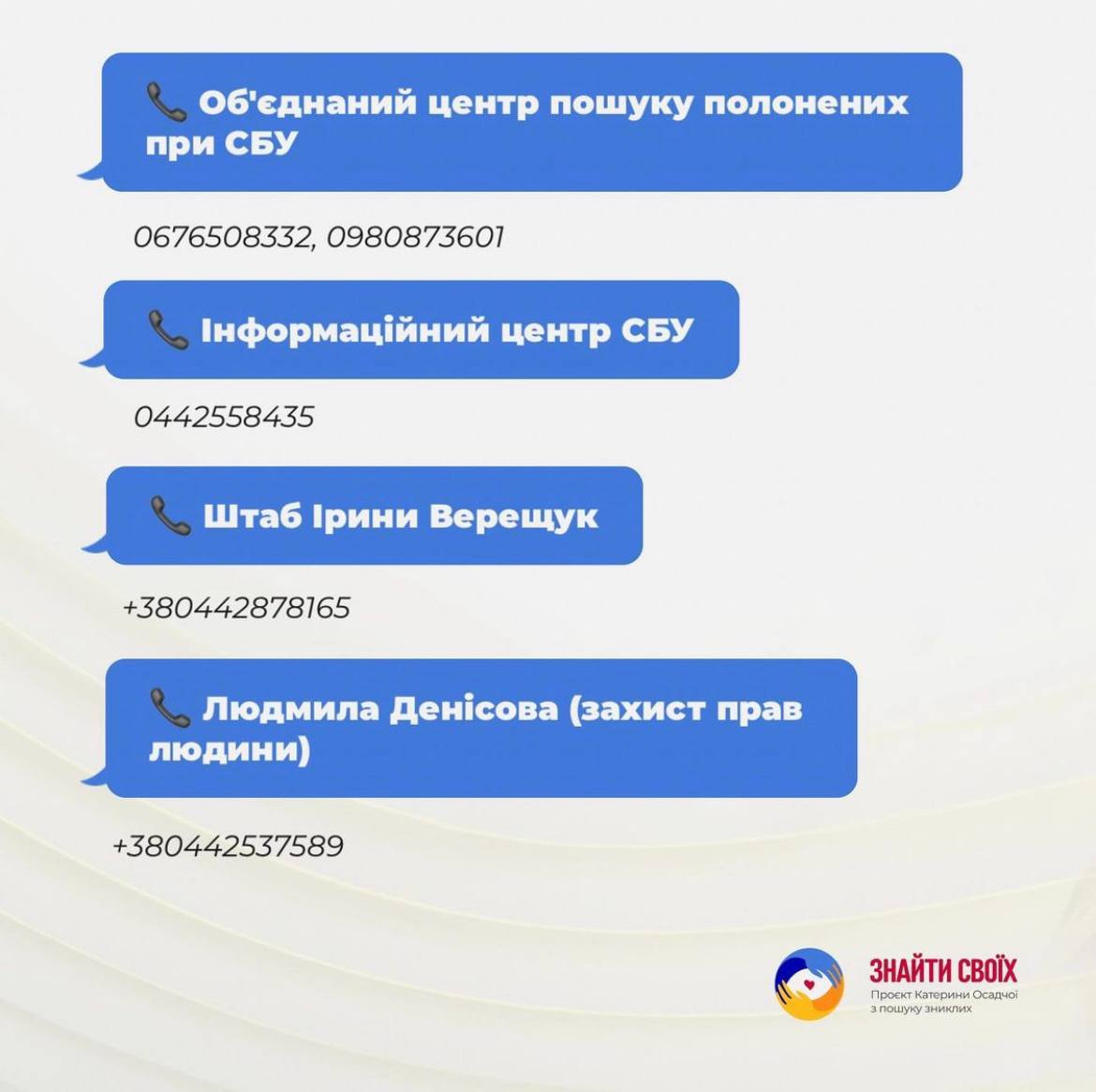 Since our team actively cooperates with law-enforcement agencies, we ask you to inform us about the combatants who can now be rehoused on the controlled territory of Ukraine. We guarantee a clear communication.