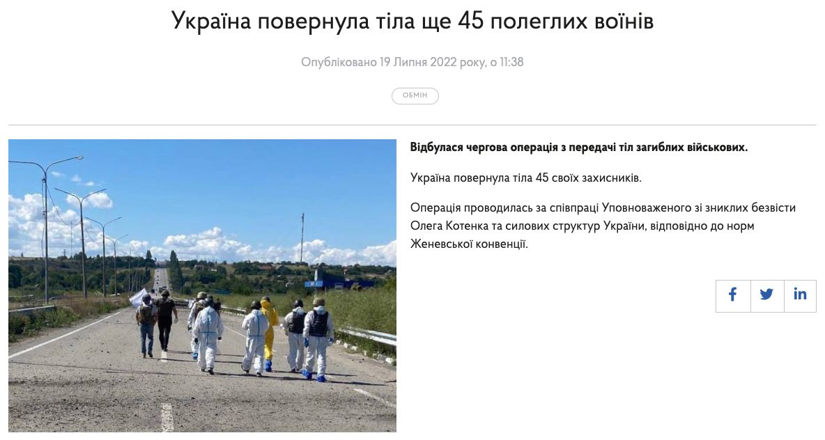 The exchange operation was carried out with the cooperation of the Commissioner for Missing Persons Oleg Kotenko and Ukrainian law enforcement agencies, in accordance with the norms of the Geneva Convention.