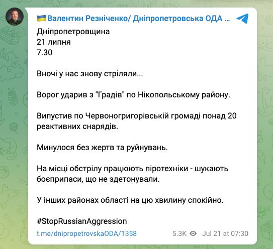 Pyrotechnics are working at the site of the shelling - they are looking for undetonated ammunition, said the head of the Dnipropetrovsk OVA Valentin Reznichenko.