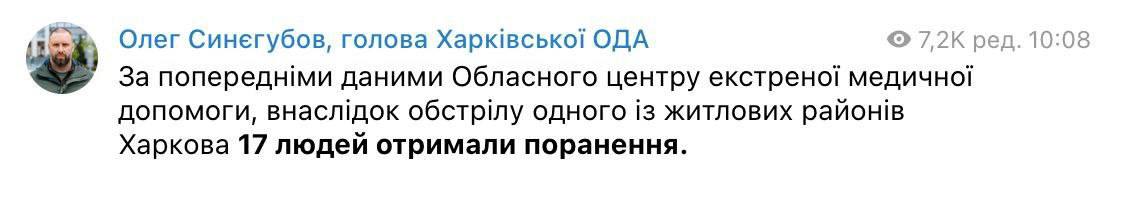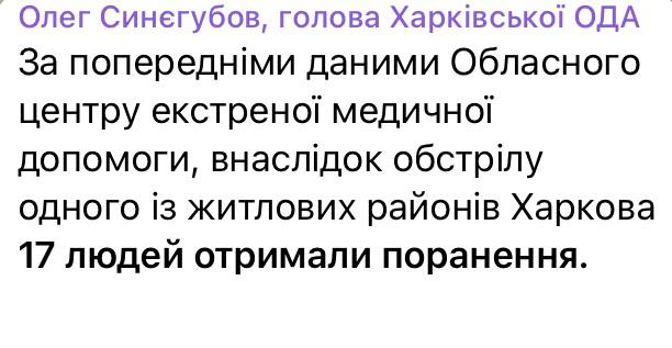 Eleven people were injured. In m. Kharkiv - 3, including a 15-year-old girl. In the Chuguyevskiy district there were 5 injured, in Bogodukhivskiy district - 2, in Izium - 1.