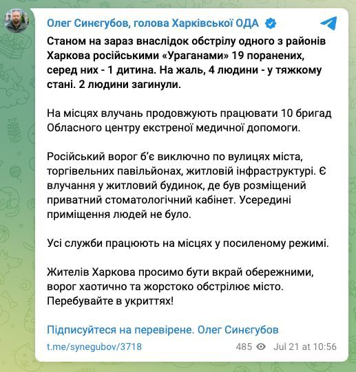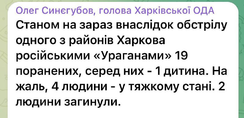 ▪️Worryingly, 4 civilians were killed during the day as a result of shelling by the occupants in Kharkivshchyna. Three were in Kharkiv, including a 13-year-old child. A 72-year-old man was killed in the Bogodukhiv region.