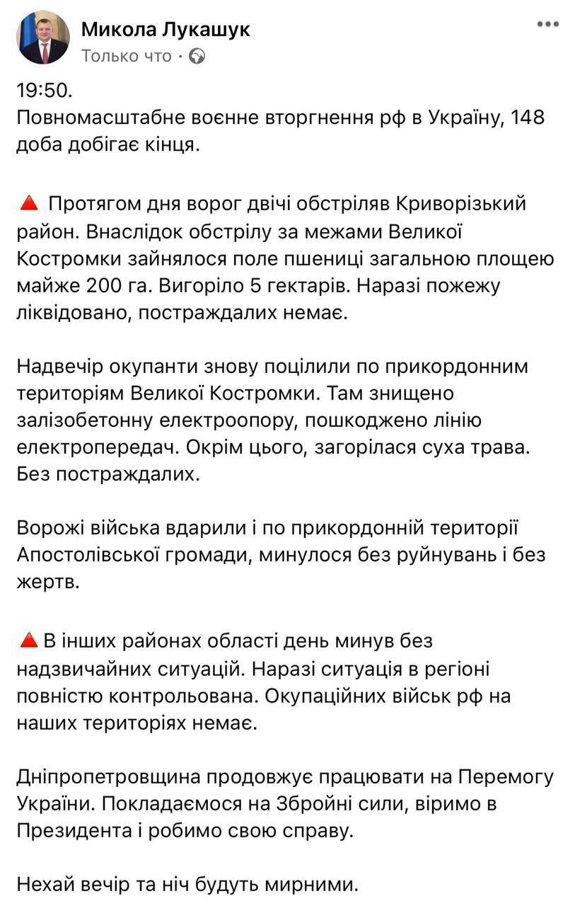In the Dnipropetrovsk region, the occupants shelled the Sinelnikovsky district