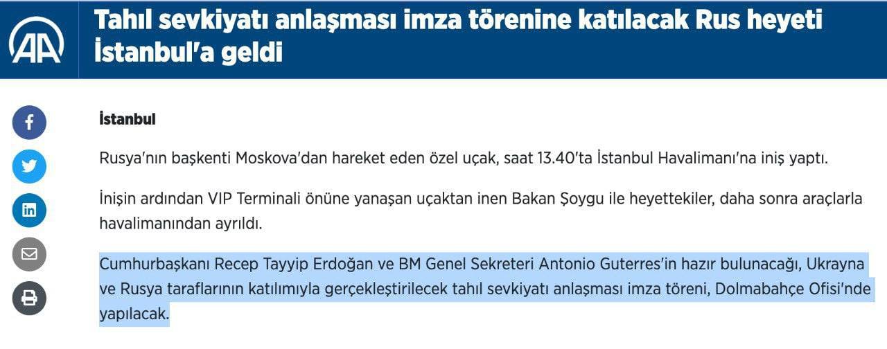 The signing ceremony will be held with the participation of Ukraine and Russia, in the presence of Turkish President Recep Tayyip Erdogan and UN Secretary-General António Guterres at the Dolmabahce Palace, where the Russians are already publishing video👆