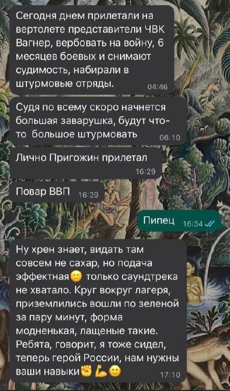 From the hotline of Gulagu.net: "I am serving a term in the convoy of the military regime and today Prigozhin himself flew to us on a helicopter and conducted an agitation, as a result of 800 people filled out questionnaires for about 150 people, they promise to conduct a polygraph check in a few days and take them straight to Ukraine.