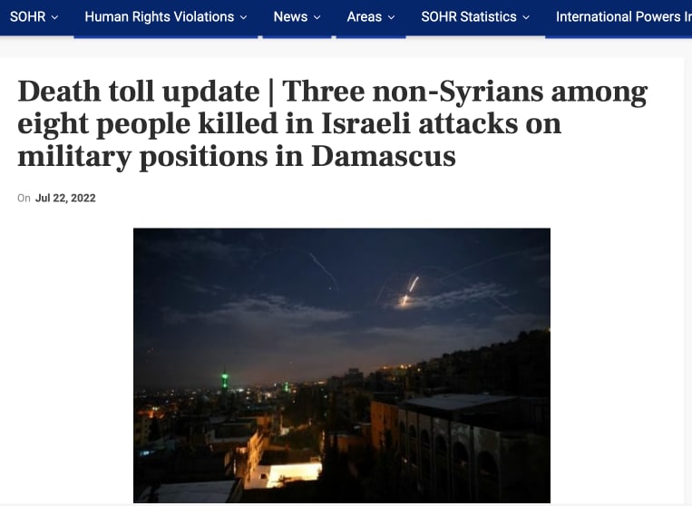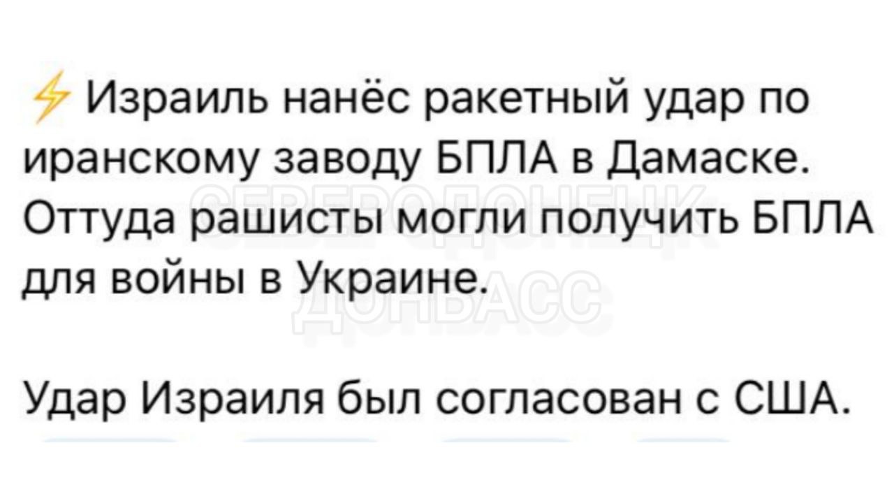 The Syrian Observatory for Human Rights (SOHR) reports that Israel launched an airstrike on targets near Damascus, in the As-Sayyida Zaynab area, and destroyed a factory where Iranian technology was used to build unmanned aircraft.