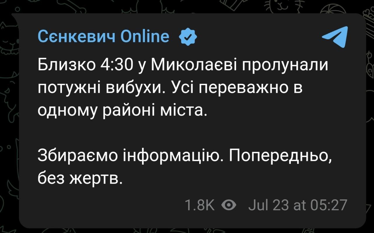 At about 4:30 a.m., heavy explosions occurred in Mykolayiv. All mostly in one area of the city. We are gathering information. In the meantime, no casualties, - announced the mayor of Mykolayiv Oleksandr Senkevich.