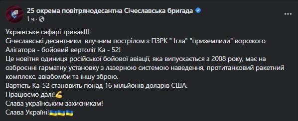 ❗️ Combatants of the 25th Separate Airborne Brigade of the DShV shot down a Russian Ka-52 helicopter.