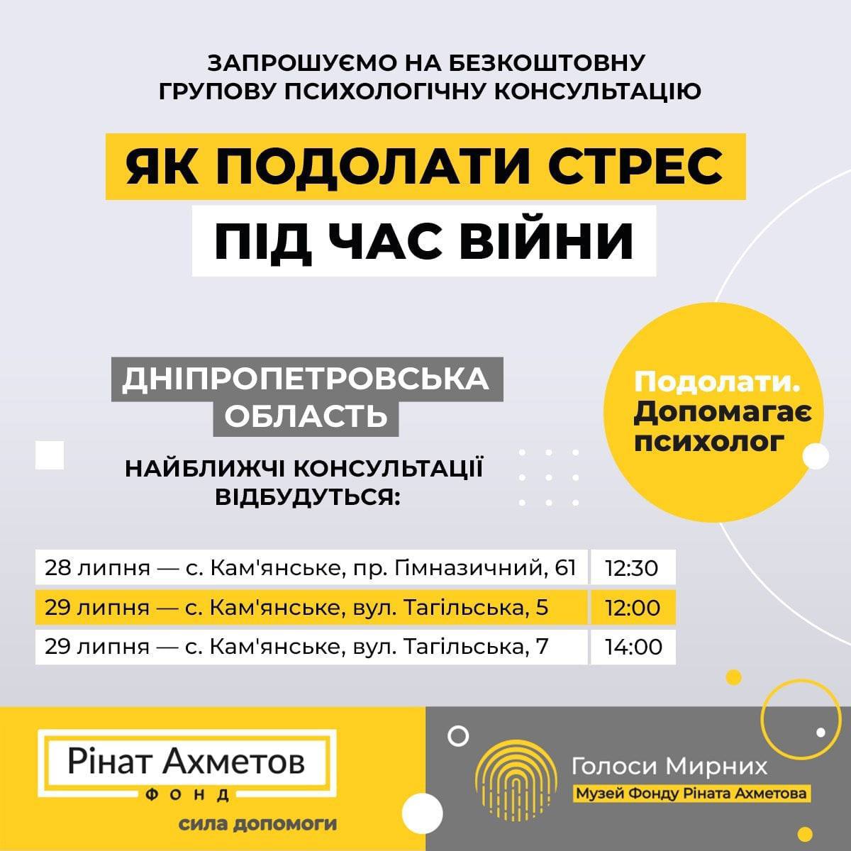 💛 Mobile teams of psychologists from Rinat Akhmetov's Foundation conduct free group consultations on the topic "How to overcome stress during the war".