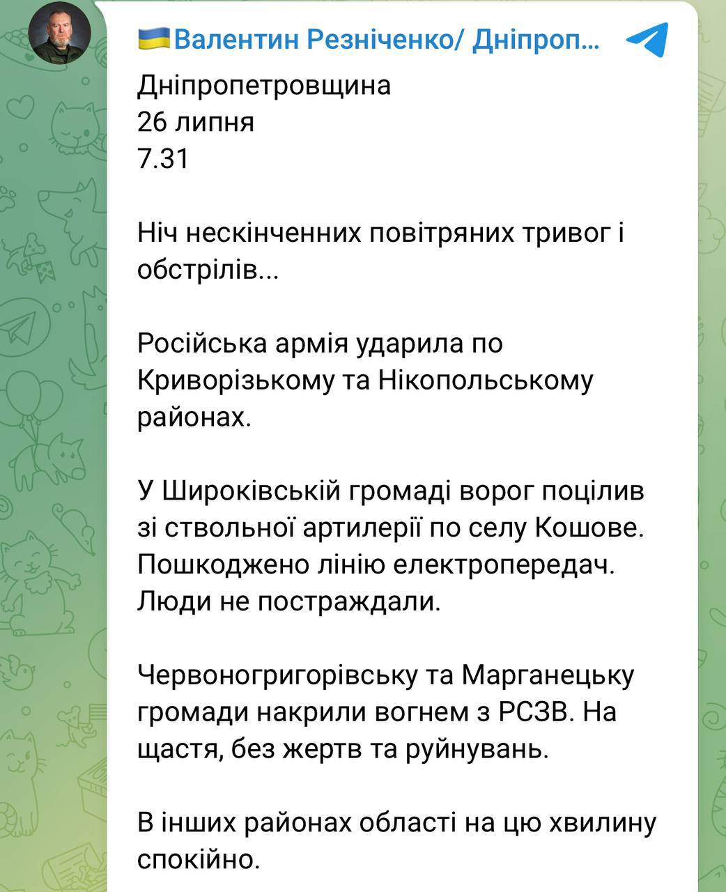 The head of the Nykopolsk District Military Administration Yevhen Yevtushenko asked to go to the corridors. Local residents report bombings