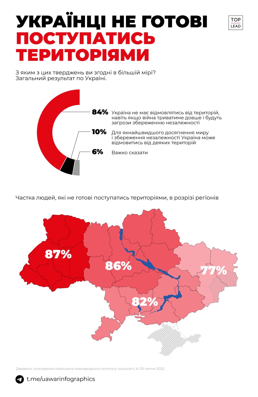 84% of Ukrainians believe that Ukraine does not have to surrender its territories to end the war quickly. There is an interesting correlation: the more the region suffers from hostilities, the less the population is not ready to surrender territory.