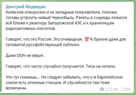 Russian spokesman Nebenzia did not support the demilitarization of the zone. He cynically stated that Russian troops are "protecting" the nuclear power plant "from strikes by the Ukrainian Armed Forces.