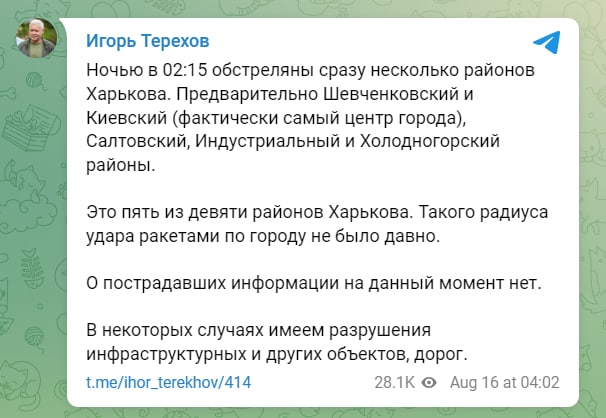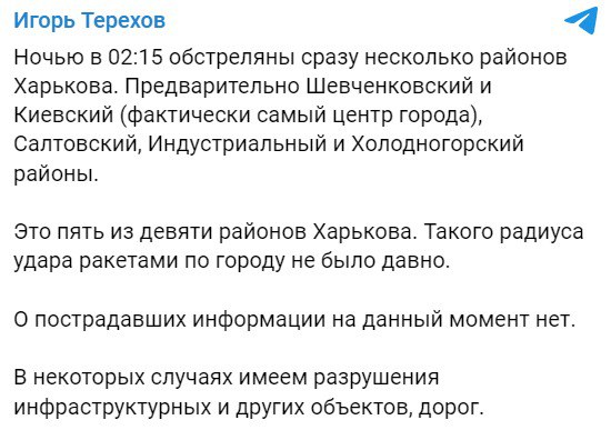 At 02:15 last night, several districts of Kharkiv were shelled at once. Primarily Shevchenkivskyi and Kiyevskyi (actually the very center of the city), Saltivskyi, Industrialnyi and Kholodnogirskyi districts. Such a radius of missile attacks on the city has not been seen for a long time.