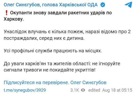 ⚡️ As a result of the shelling of Kharkiv, two people were injured, said the head of the OVA Oleg Singubov.