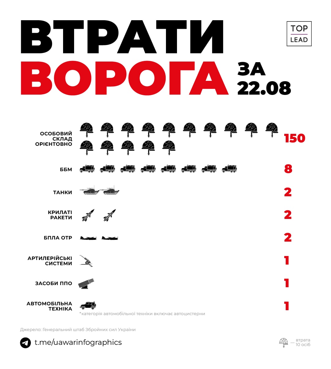 На сегодняшней день известно уже о примерно 45 550 погибших рашистах, тогда как в армии Беларуси всего 45 тысяч солдат (по данным на 2021 год).