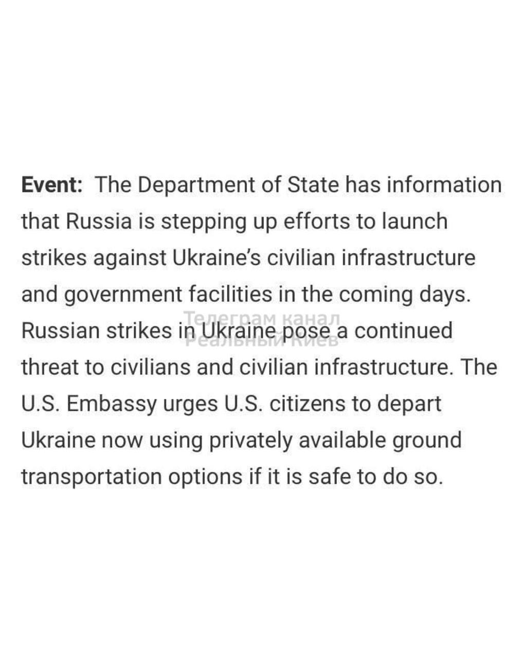 "The State Department is in possession of information that Russia is stepping up efforts to strike Ukraine's civilian infrastructure and government facilities in the coming days," the statement said.