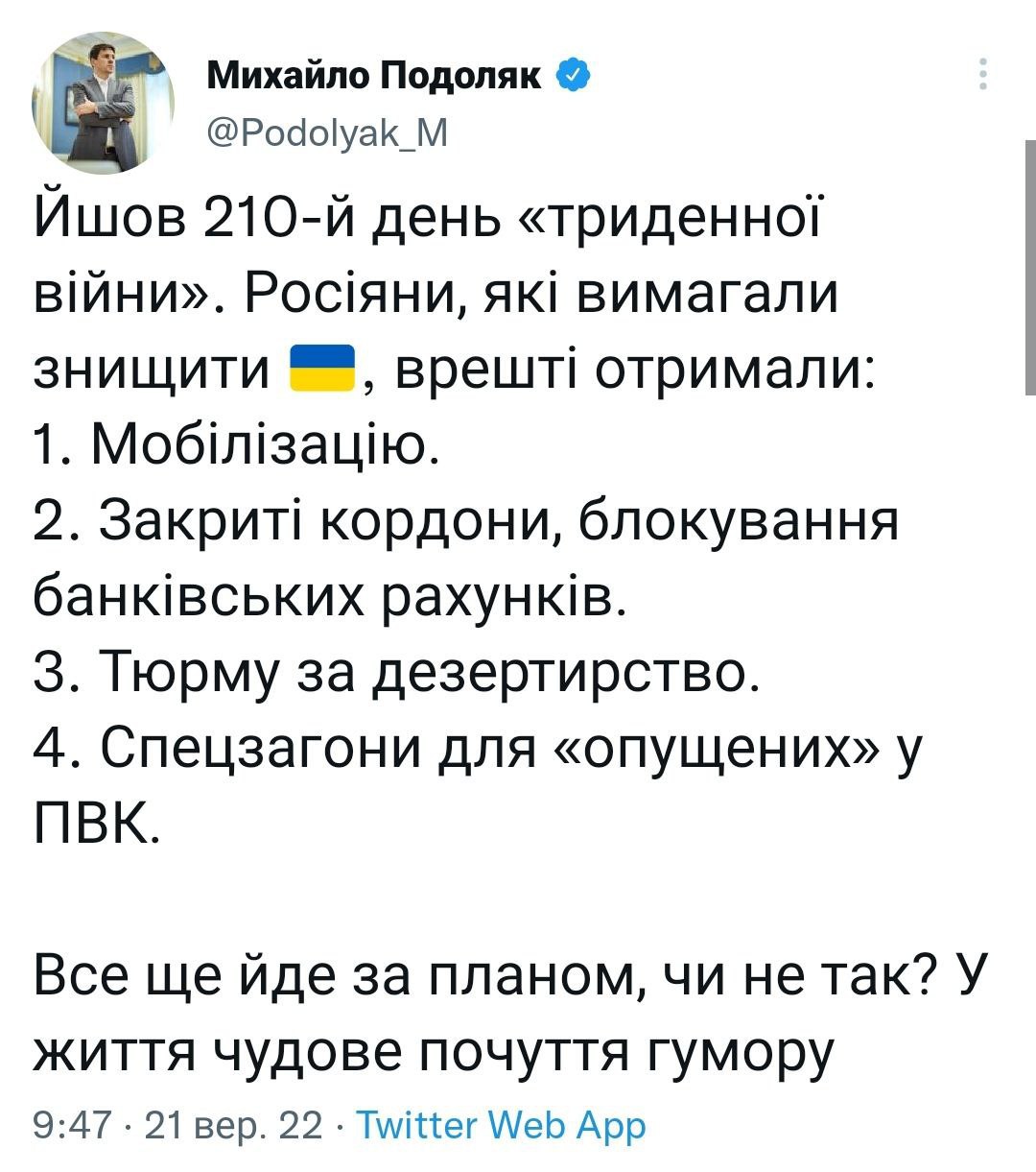 👌🏻Подоляк вдало описав всі "переваги", які отримали росіяни, що так яро вимагали знищити Україну