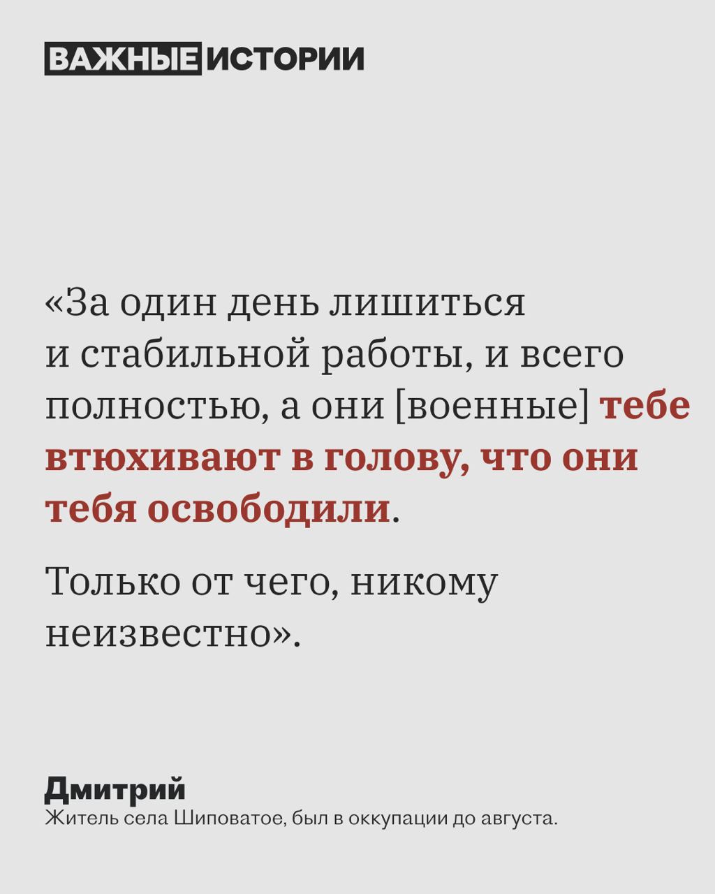 "Близькі для мене люди жили на окупованій території в період першого етапу російського вторгнення 2014-2015 року. Коли їм вдалося евакуюватись, вони розповідали, що рашисти робили приблизно те саме, що і в Бучі, і в Ізюмі в багатьох містечках Луганщини та Донеччини (гвалтували, вбивали, катували), просто через окупацію та тотальну брехливу пропаганду це не потрапляло в ЗМІ, або злочини росіян намагались представляти як "дії українських диверсантів" і т.д. А ті, хто заперечував, або був свідками воєнних злочинів - зникали або їх залякували. Поступово під окупацією та щільною пропагандою у деяких людей навіть виникав "Стокгольмський синдром".