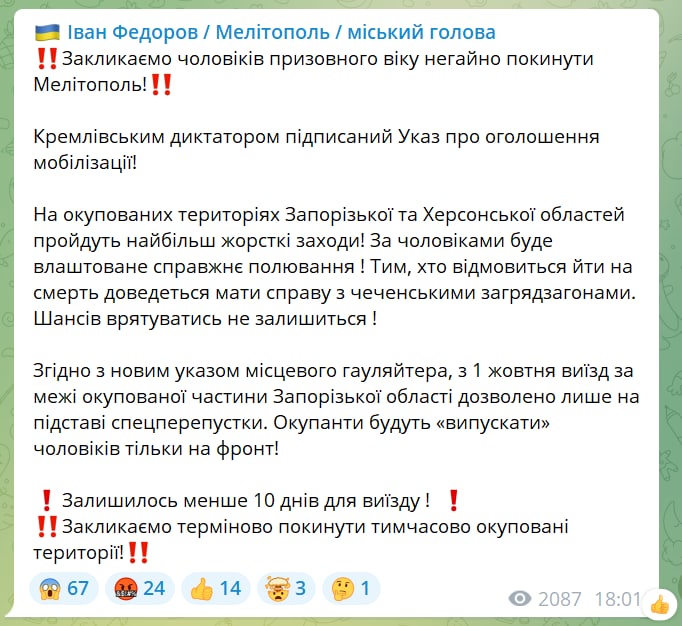 ⚠️ The whole of Russia is on its ears. Mobilization has been announced. She's giving up her momentum.