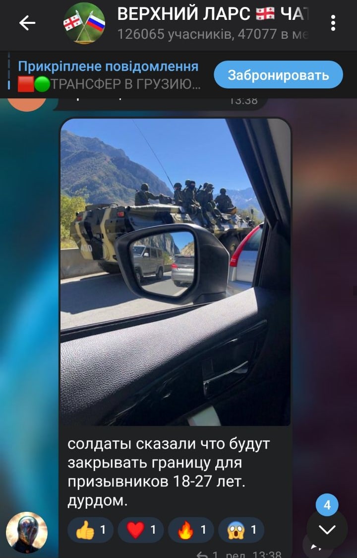 Біля КПП «Верхній Ларс» на кордоні росії та Грузії з'явилися російські військові для подальшого розгортання блокпостів. Таким чином намагатимуться зменшити потік біженців від могилізації на росії