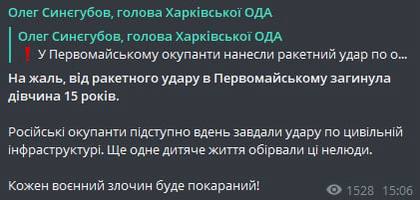 In Pervomaiske, the occupants launched a missile attack on a civilian infrastructure facility. In addition, critical infrastructure was damaged and 2 private houses were completely destroyed, - Head of Kharkiv Regional Military Administration Oleh Syniehubov