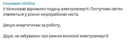 Power supply resumed in Mykolaiv - Mayor Senkevich
