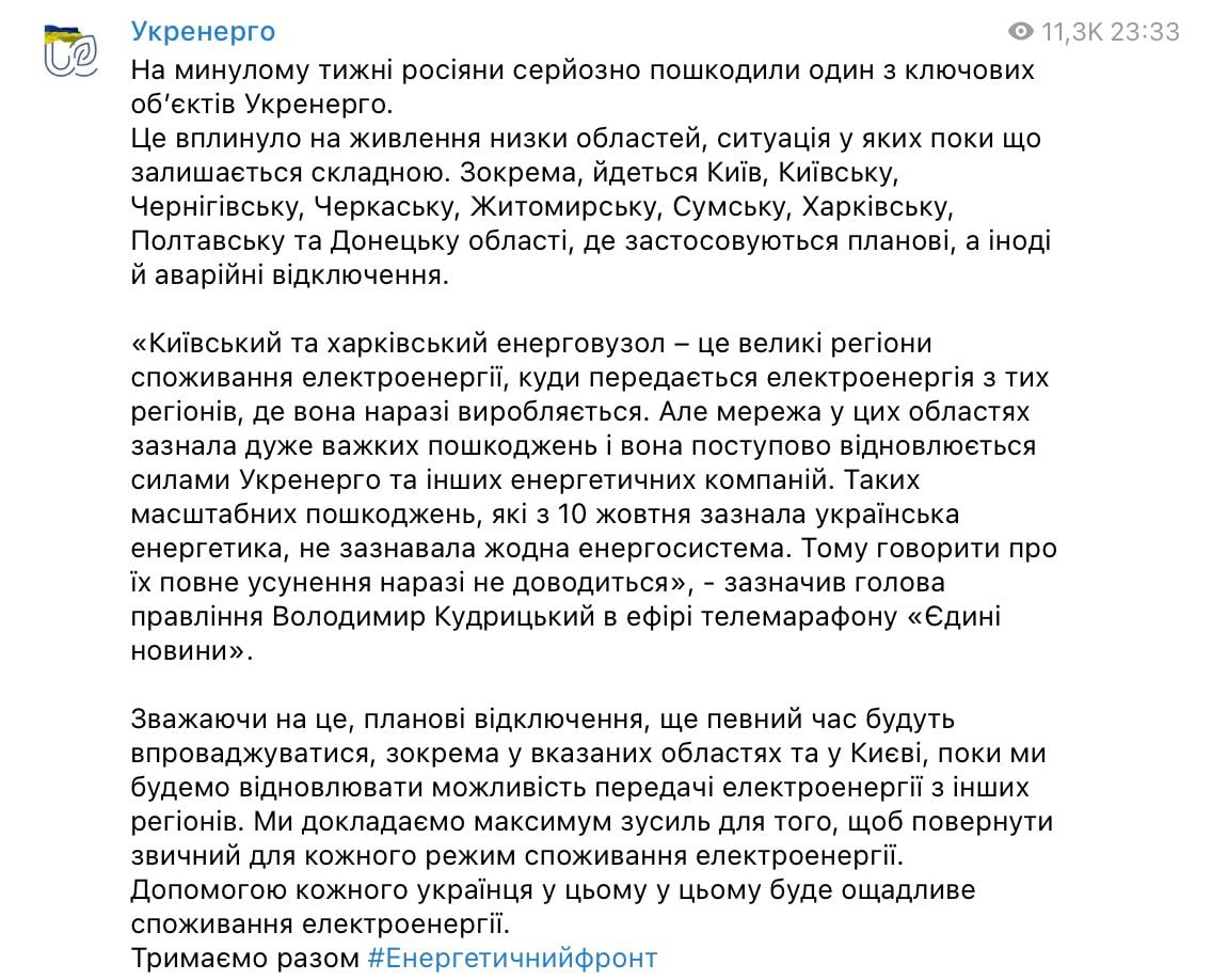 Ранее планировалось, что в Украине за 2 недели восстановят большинство повреждений электросетей, но россия в очередной раз атаковала объект критической инфраструктуры.
