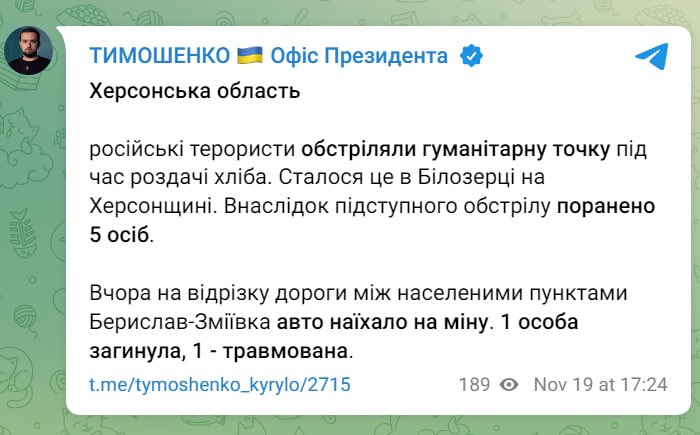 "Terrorists from russia are hitting humanitarian points in the de-occupied territories. The pathetic tactics of lowly "sovoks." Every such detail in the puzzle of russia's crimes will be proof of a tribunal, future punishments and compensations to Ukrainians," Yermak said.