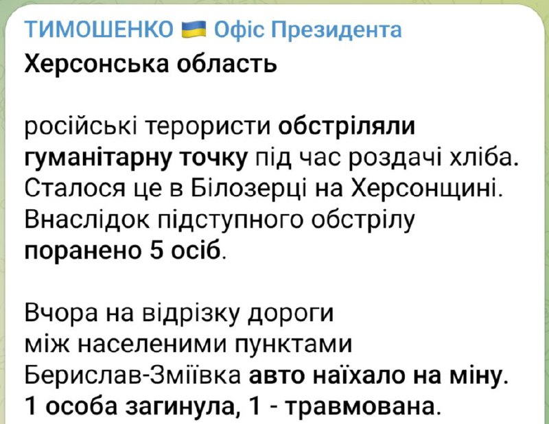 «Террористы из россии бьют по гуманитарным точкам на деоккупированных территориях. Жалкая тактика ничтожных "совков". Каждая такая деталь в пазле преступлений россии будет доказательством трибунала, будущих наказаний и компенсаций украинцам», — отметил Ермак.