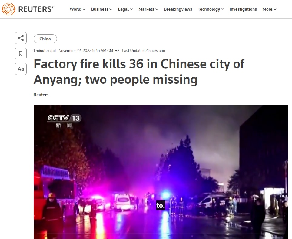 Внаслідок пожежі на заводі в Китаї щонайменше 36 людей загинули, двоє людей постраждали, ще двоє вважаються зниклими безвісти — телеканал CGTN.