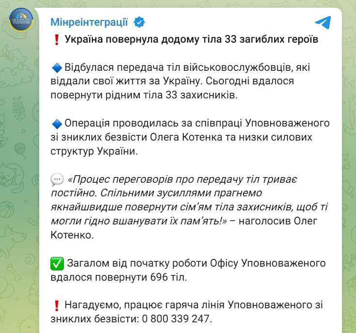 📌 Recall that to apply for a kit, you must call the Ministry of Reintegration hotline: 15-48 or to the Office of the Commissioner for Internally Displaced Persons at the number: +3 8 066 813 62 39.