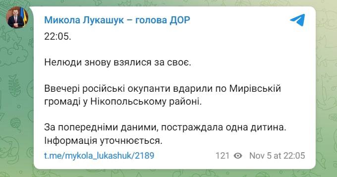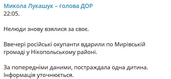 Внаслідок обстрілу Нікопольского району на Дніпропетровщині поранена дитина — голова обласної ради Микола Лукашук.
