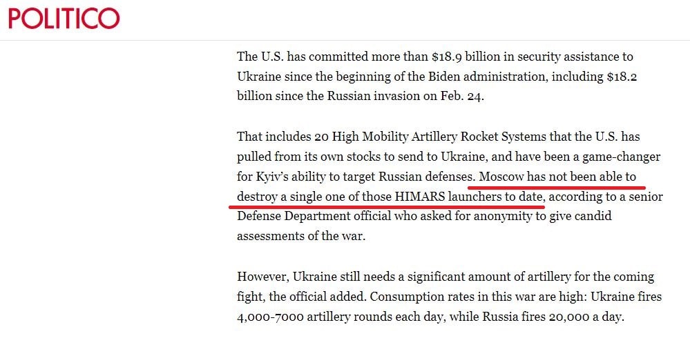 К текущему моменту Россия не смогла уничтожить ни одной установки HIMARS, переданной США Украине-
