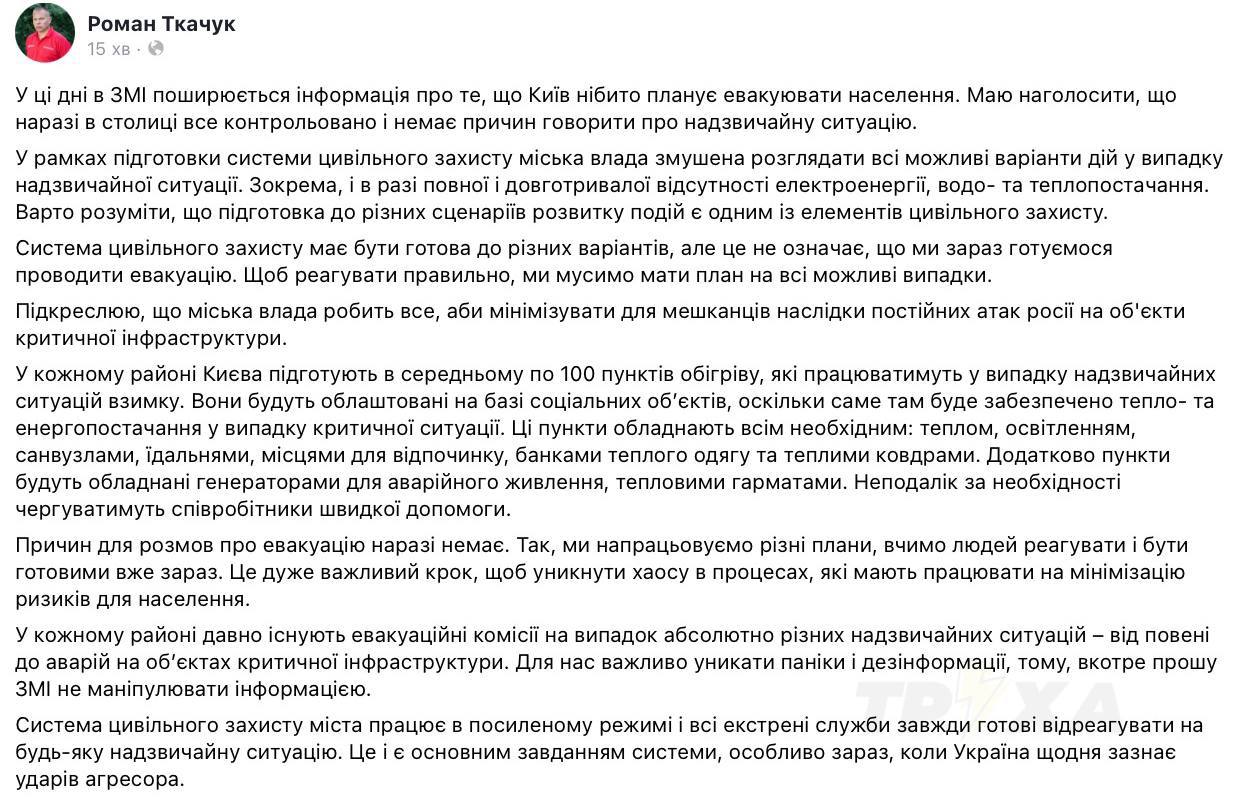«Причин для розмов про евакуацію наразі немає. Так, ми напрацьовуємо різні плани, вчимо людей реагувати і бути готовими вже зараз. Це дуже важливий крок, щоб уникнути хаосу в процесах, які мають працювати на мінімізацію ризиків для населення. У кожному районі давно існують евакуаційні комісії на випадок абсолютно різних надзвичайних ситуацій – від повені до аварій на об’єктах критичної інфраструктури», – наголосив Ткачук.
