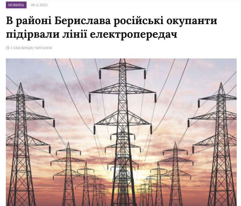 Российские захватчики взорвали линии электропередач в районе оккупированного Берислава Херсонской области, сообщает местное СМИ со ссылкой на местных жителей