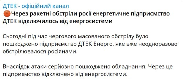Ukrenergo declared an emergency due to rocket attacks.