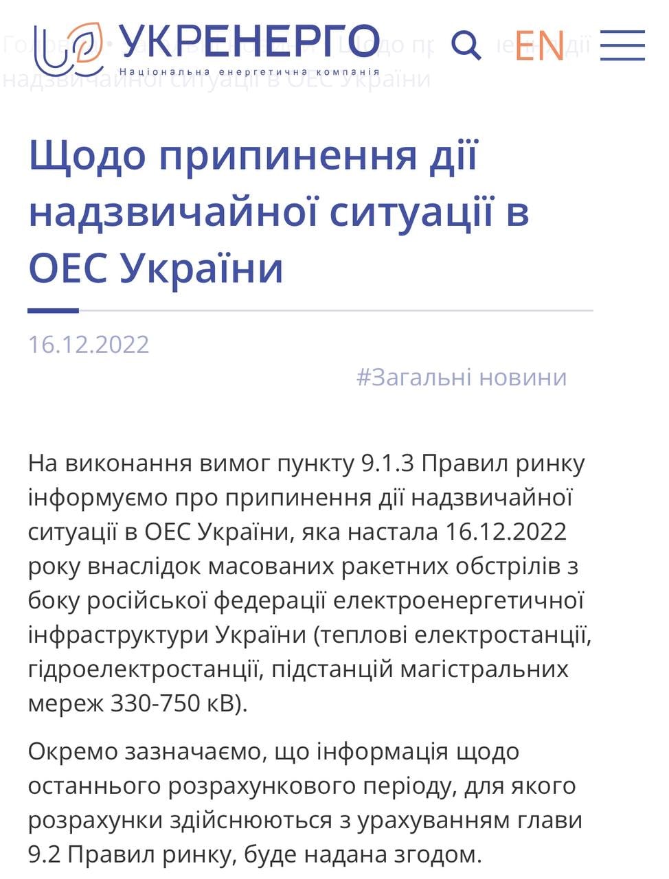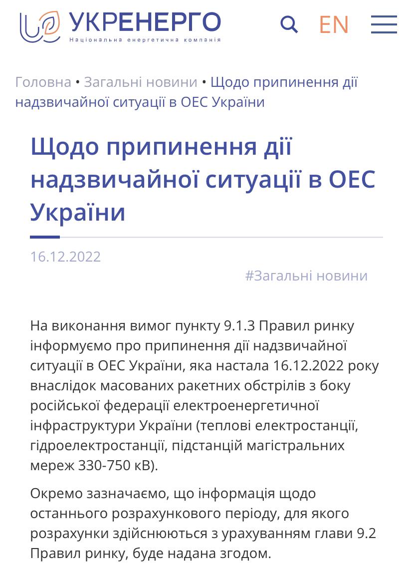 ❗️Укренерго скасувало дію надзвичайної ситуації в ОЕС України
