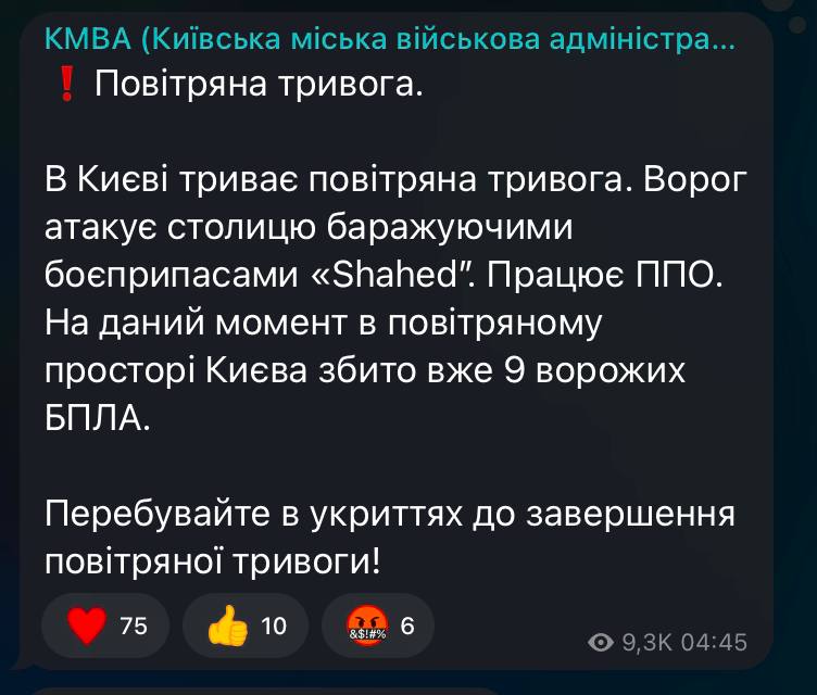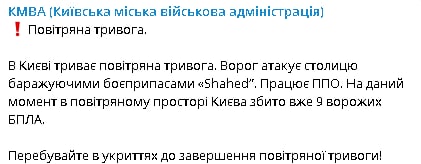 Air raid alert continues in Kyiv. The enemy is attacking the capital with Shahed barrage munitions. Air defense is working. At the moment 9 enemy UAVs have been shot down in Kyiv airspace.