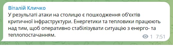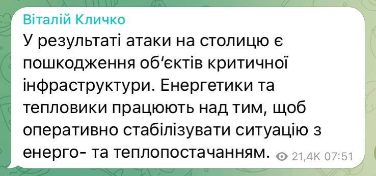 Повідомляють, що в Києві один приліт і одна відпрацьовка. Інфа поки не підтверджена