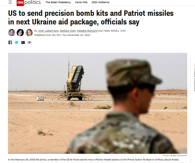 Forwarded from СУСПІЛЬНЕ НОВИНИ У Білому домі підтвердили, що планують передати Україні систему Patriot. Вона буде в новому пакеті допомоги на майже 2 мільярди доларів, про який має оголосити президент США Байден. Вони навчатимуть українських військових користуватися системою у третій країні, пояснили в Білому домі.
