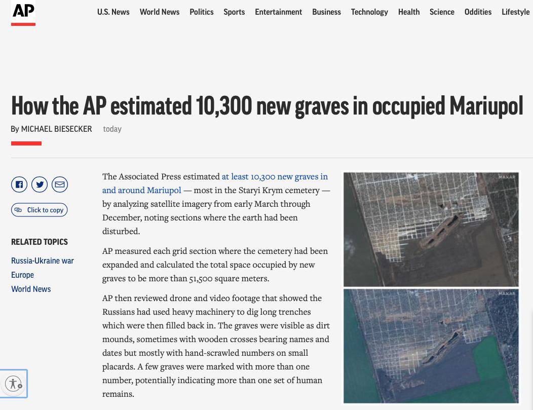 Агентство AP с марта насчитало не менее 10 300 новых могил в оккупированном россиянами городе. Общая площадь, занятая могилами, составляет более 51500 квадратных метров.