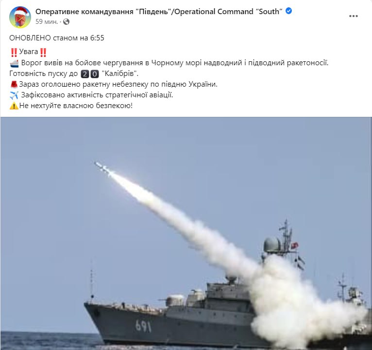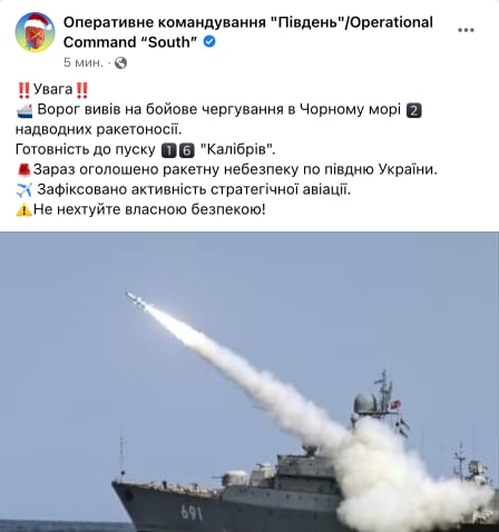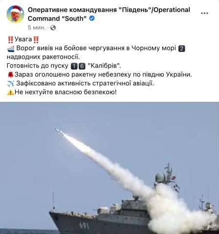 "Враг вывел в Черное море ракетоносители. В готовности к пуску 16 "Калибров". Также замечена активность стратегической авиации", - ОК"Південь".