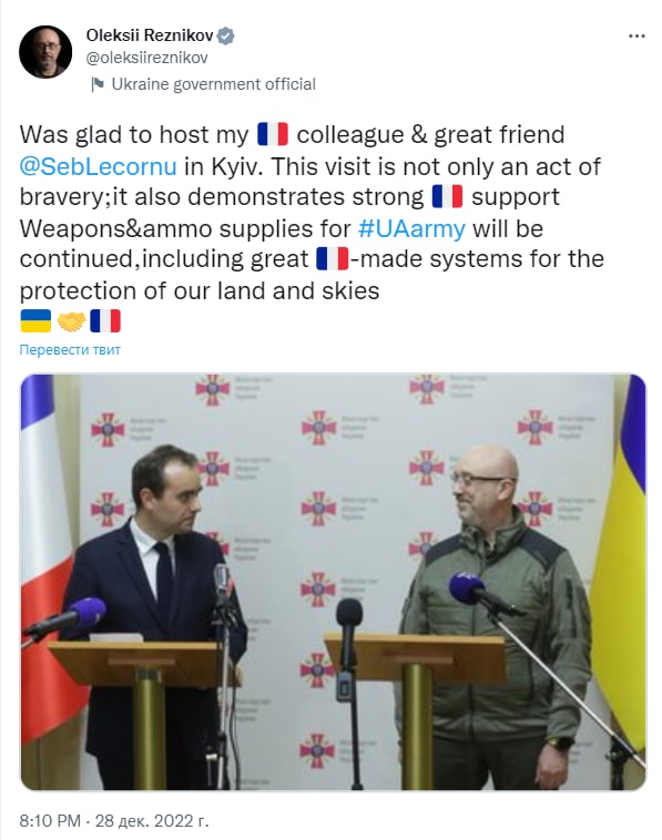 Supplies of weapons and ammunition for the Ukrainian army will continue, including excellent French systems to protect our land and skies," wrote the head of the Ukrainian Defense Ministry after the talks.